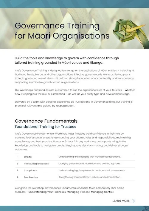 Govern with confidence through tailored training grounded in Māori values. We’ll empower you with the knowledge and tools to navigate complexities, improve decision-making, and deliver stronger outcomes for your Trust, Marae or organisation.